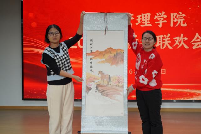 在温情与祝福交织的氛围中,献画节目《骏程万里,桃李春风》缓缓展开,由李霞老师作为献画代表进行呈现。作品寓意深远、情感真挚,寄托了对学院育人事业薪火相传、桃李满园的美好祝愿,也为整场联欢会增添了浓厚的文化气息与精神内涵。