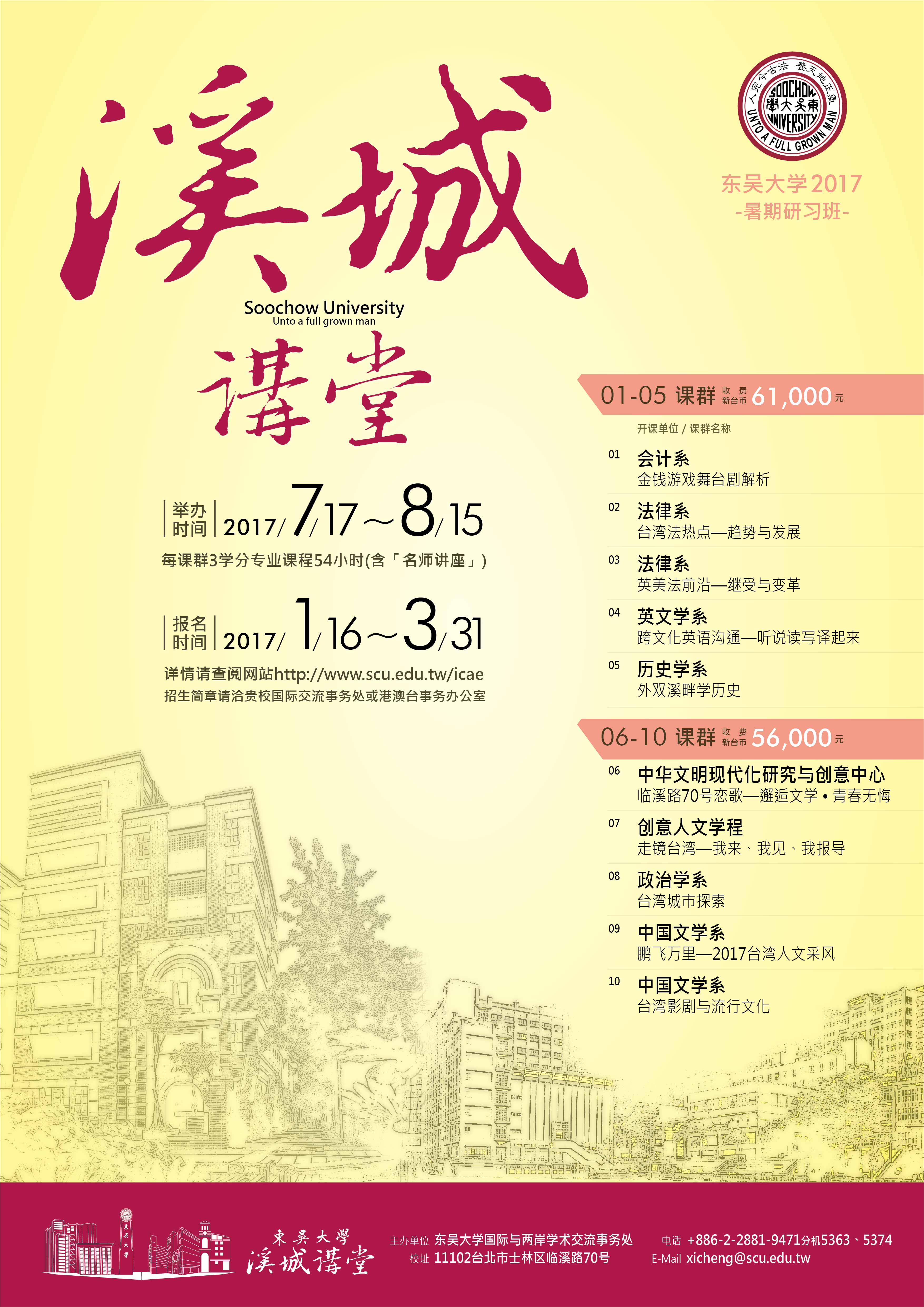 为加强海峡两岸高等教育交流与合作,增进两岸学子间的沟通与了解,东吴大学自 2013 年起 开办「溪城讲堂」暑期研习班。冀藉由本校各院系深具教学特色的品牌课程,提供大陆优秀青 年学子利用暑期来校研习课程,并参加旅游及参访。本项活动最重要的目的在于提供一个多元 学习平台,让所有报名参加的大陆学生在获得专业知识的同时,更有充裕时间深入了解台湾的 风土民情。