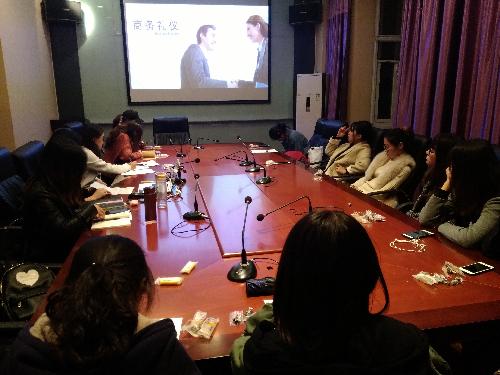 3月27日晚,由工商管理学院研究生会主办的商务礼仪培训活动在敏行楼新会议室举行。本次培训旨在塑造研会成员的仪表体态,提升大家在正式场合的社交效率,增强同学们未来在职场中的竞争力。2018级研究生白莎和焦昕婷为主讲人,活动由研究生会主席张曼玉主持,研究生会全体成员参加了此次培训。
