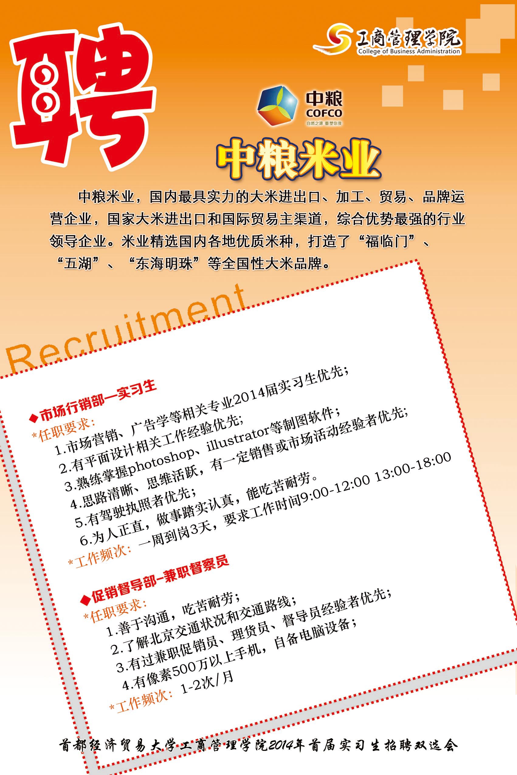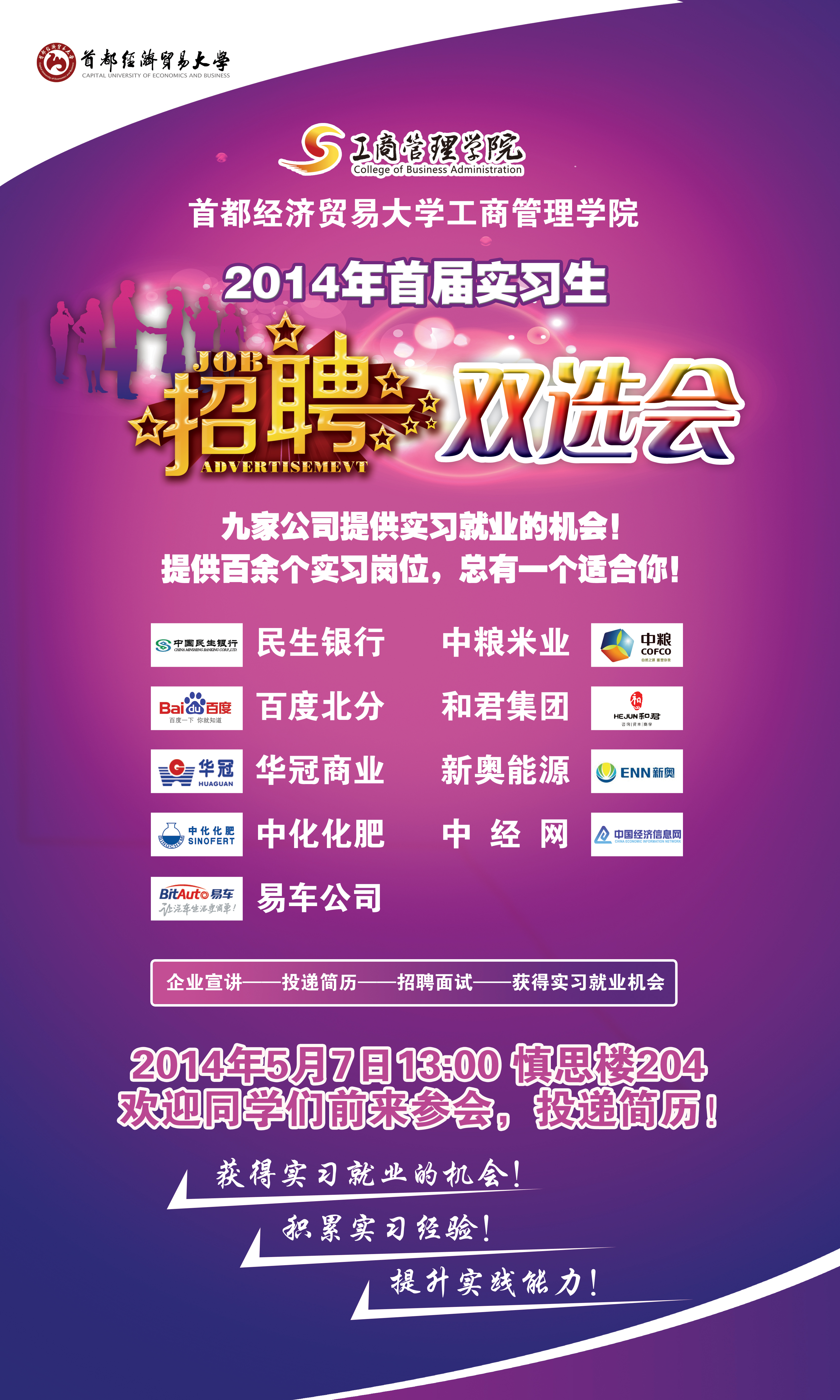 家知名企业,包括民生银行、北京华冠商业、中粮米业、和君集团、新奥集团、百度公司、中化化肥、中经网、易车公司,为工商学子提供百余个实习岗位。