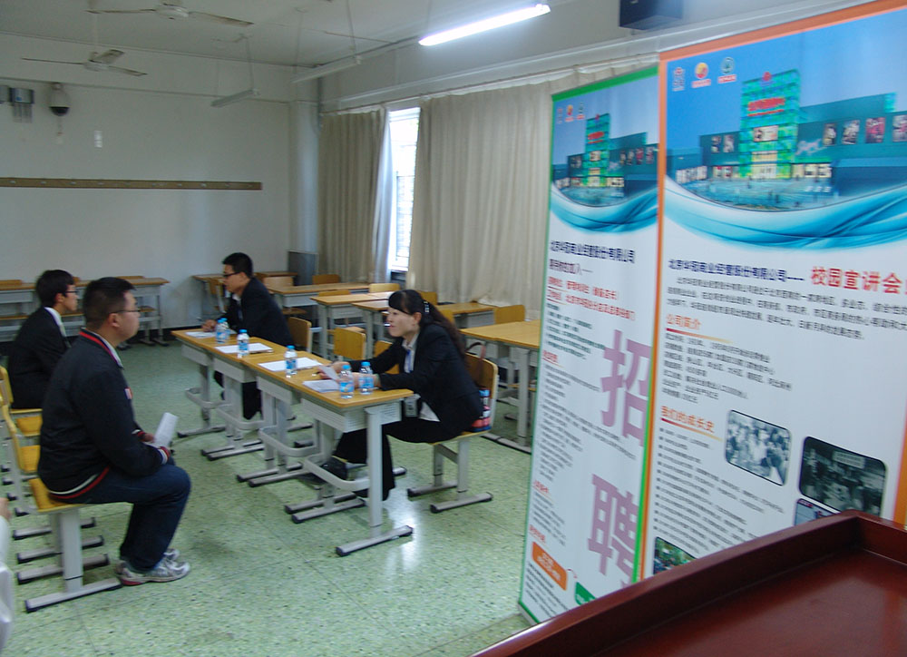 此外,学院制作了宣传易拉宝、横幅,为参会企业制作了招聘海报,张贴在单独面试教室外,并协助企业组织面试。