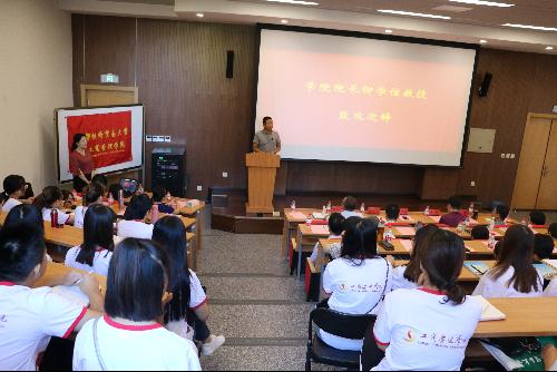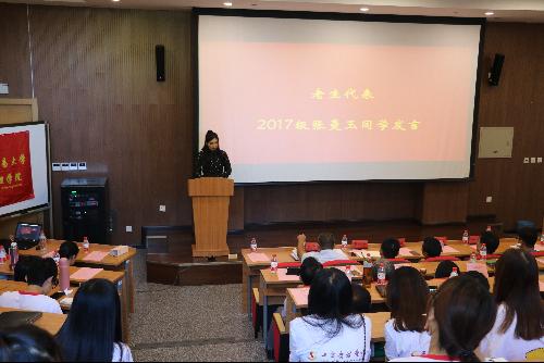 2017级硕士研究生、学院研究生会主席张曼玉作为老生代表发言。她首先恭喜新生们加入工商管理学院这个温暖的大家庭,并分享了自己在研究生生活中的感悟与收获。她以“用梦想支撑你的生活”,“用读书丰富你的内涵”,“学会聚焦学习”,“学会规划生活”这四句话勉励新生,希望大家秉承“格物致知,明体达用”的院训,抓住机遇,努力奋斗,在不久的将来成为学院的骄傲。