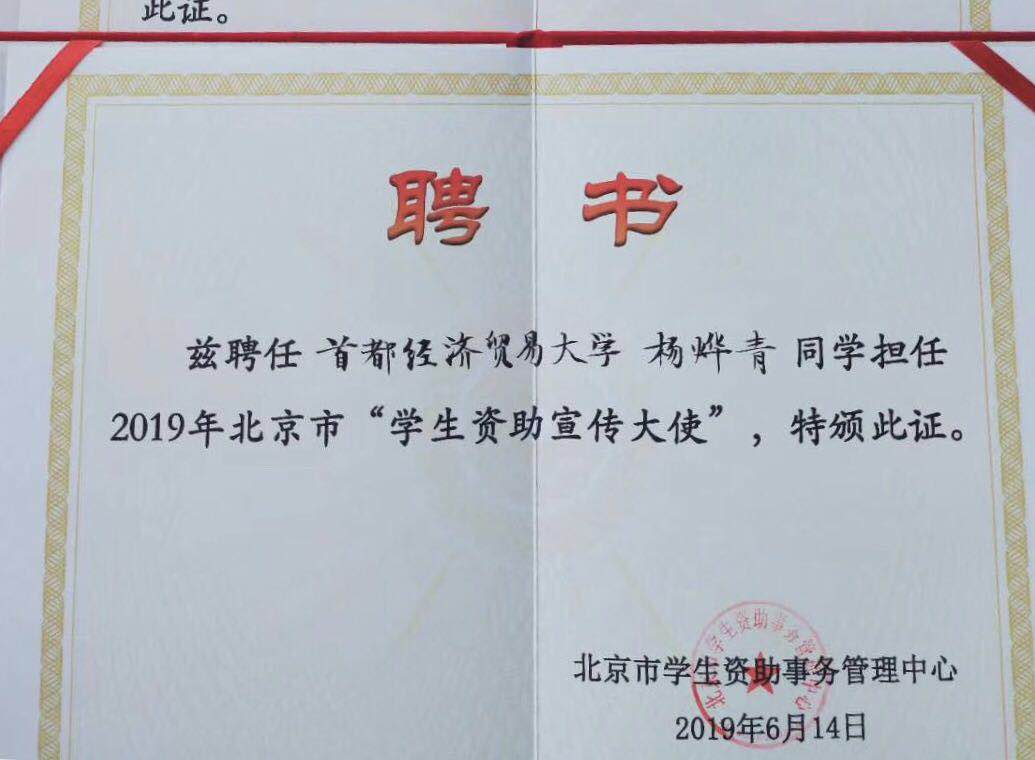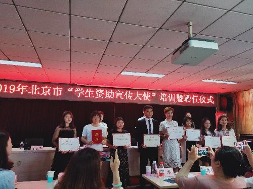 6月14日,2019年北京市“学生资助宣传大使”培训暨聘任仪式在北京市学生资助中心举行。我院校级“学生资助宣传大使”学生杨烨青被聘为北京高校市级“学生资助宣传大使”。北京市学生资助管理中心冯伟书记、张梅副主任共同为新聘任的18名宣传大使颁发聘书。