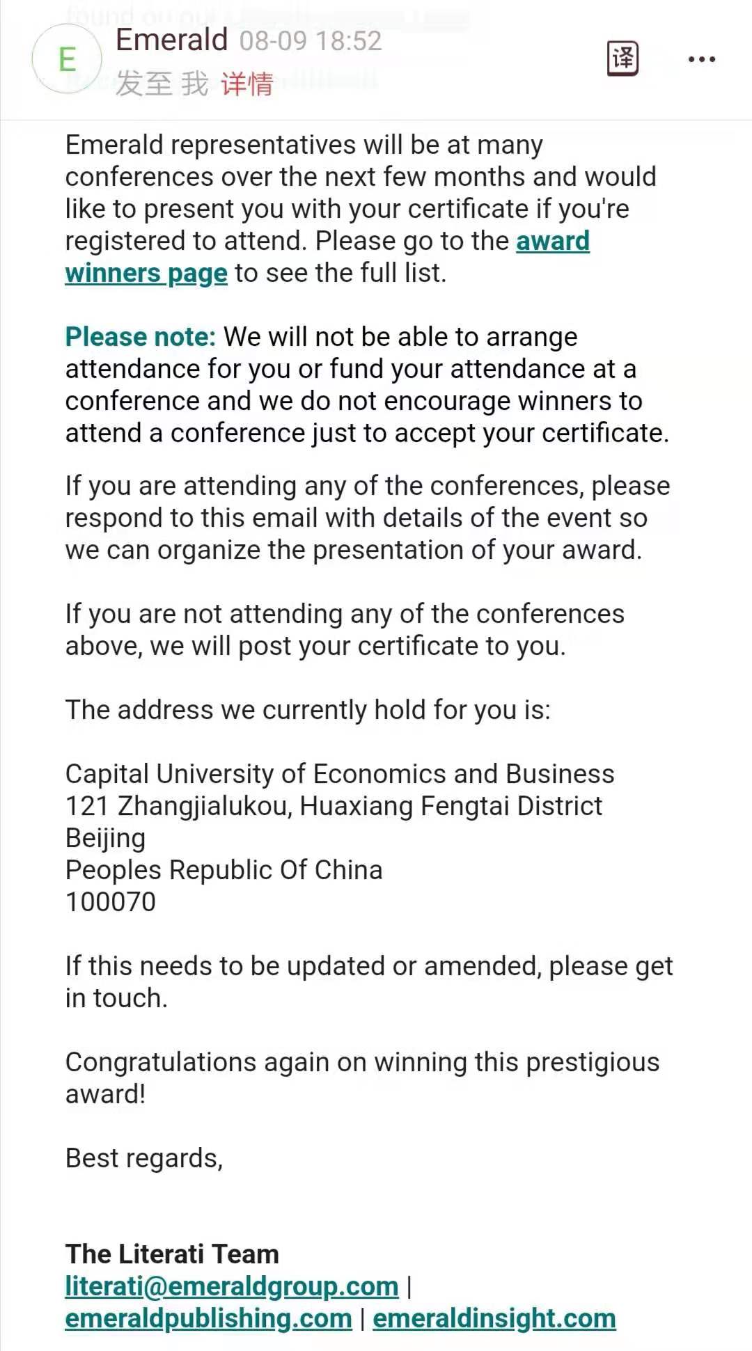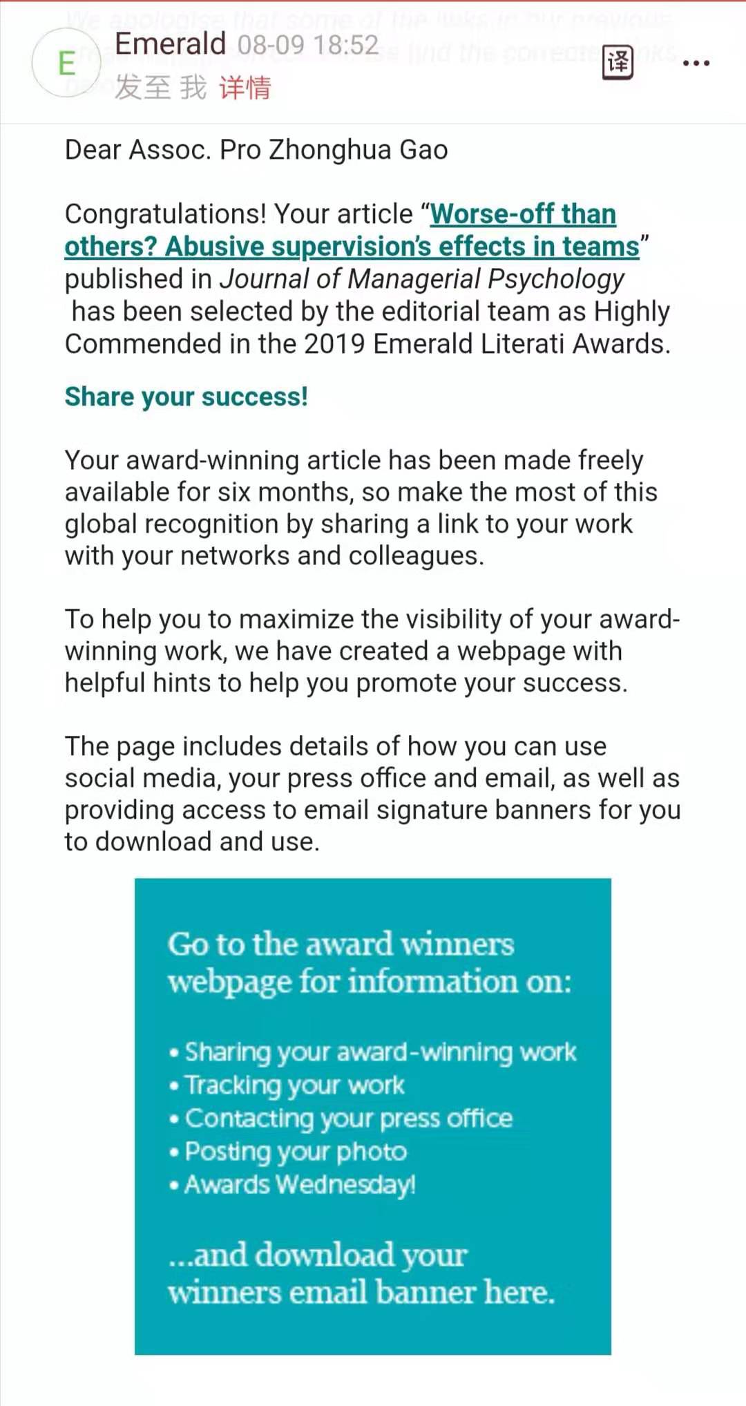 今年暑假,Emerald Literati Awards for Excellence 2019结果公布。我院教师高中华副教授作为通讯作者发表在Journal of Managerial Psychology的论文"Worse-off than others? Abusive supervision's effects in teams"被评为该期刊的年度高度评价论文奖(Emerald Highly Commended Paper Award)。Emerald是成立于1967年的国际知名学术出版机构,共管理300多种学术期刊和2500多种科研图书。Emerald每年会在所管理的学术期刊中评选Emerald Literati Awards for Excellence,至今已有25年历史。每本期刊的编委会从本刊前一年发表的所有文章中,评选出一篇Outstanding Paper和三篇Highly Commended Papers,以表彰学者的优秀研究和杰出贡献。