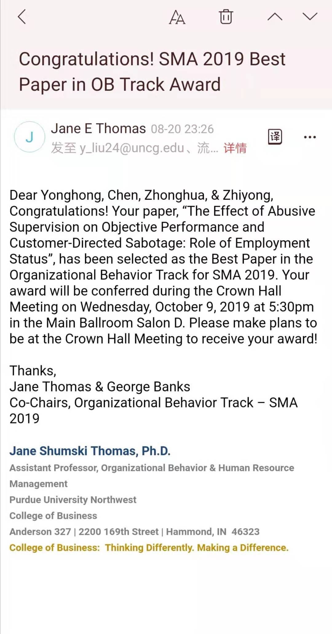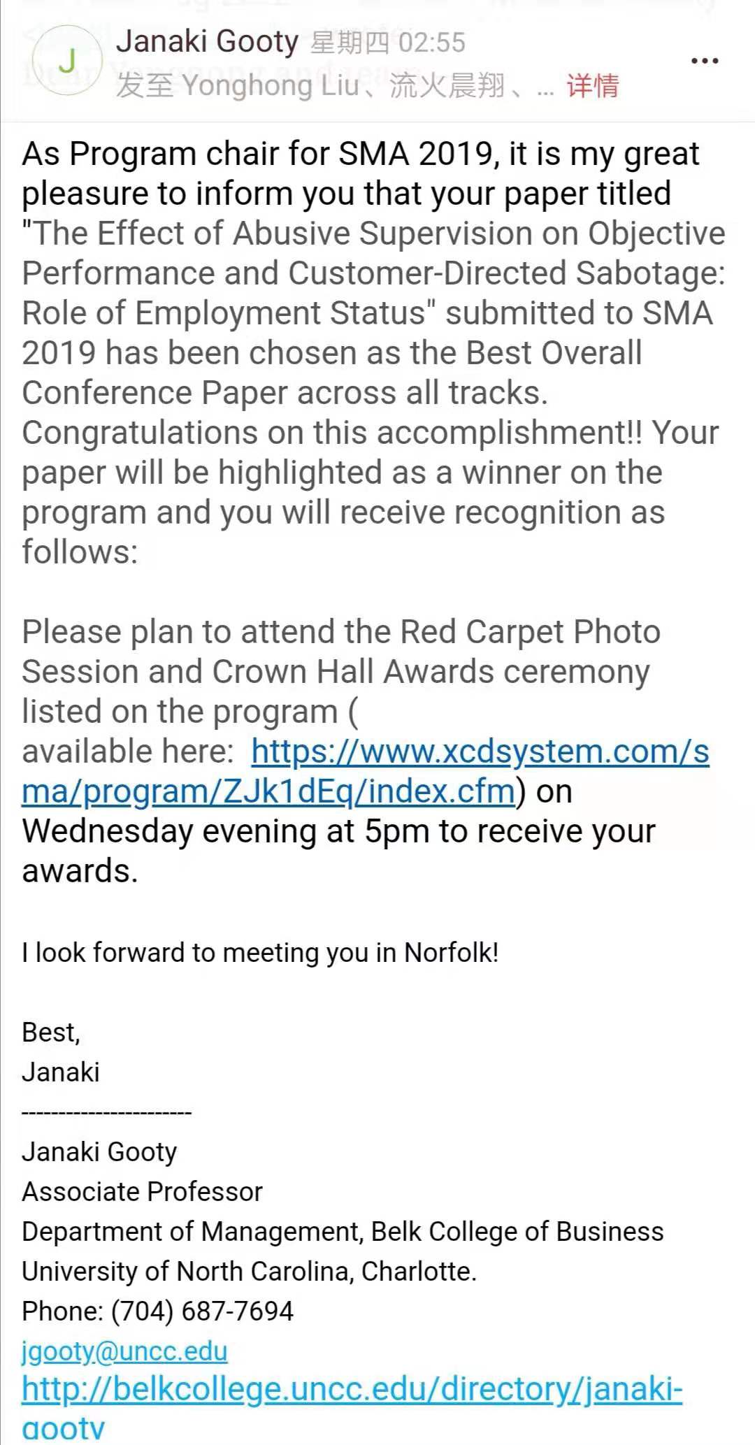 此外,开学伊始,还有另外一则科研方面的好消息。高中华老师作为共同作者身份投稿美国南方管理协会(Southern Management Association)2019年会的论文"The effect of abusive supervision on objective performance and customer-directed sabotage: Role of employment status"刚被评选为组织行为方向的最佳论文(Best Paper in the Organizational Behavior Track)。该论文还被评选为了整个大会的年度最佳论文,仅此1篇。美国南方管理协会是美国管理学会的区域分会,会刊为Journal of Management,该协会每年召开学术年会,今年的年会将于10月在美国弗吉尼亚州诺福克举办。此年会是管理学领域的高水平学术会议之一,历届年会通常会收到400-500篇论文,这些论文被划分至8个不同方向(组织行为是其中之一),每个方向会评选出一篇最佳论文加以表彰,最终大会还会评选出年度最佳论文。