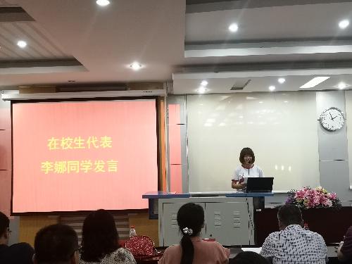 2018级硕士研究生、学院研究生会主席李娜作为老生代表发言。她通过分享自己的研究生生活中的感悟与收获,讲述自主创新的学习方式,鼓励同学们开阔自身视野,追求卓越,从而树立正确的价值观,塑造良好的德行,最终抓住机遇,努力奋斗,在不久的将来成为学院的骄傲。