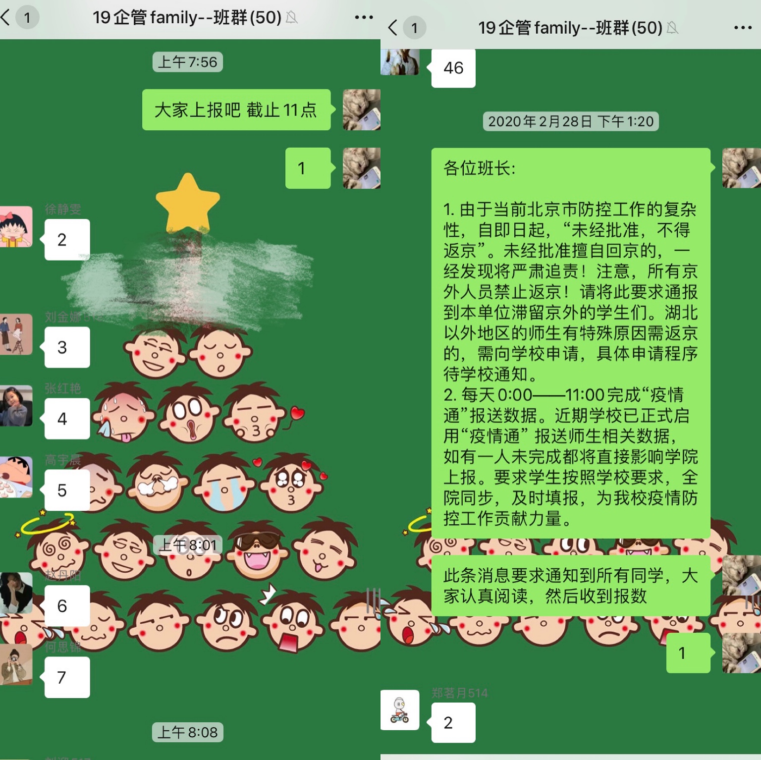已经立春了,但这个冬天似乎还看不到尽头。武汉疫情席卷全国,新冠肺炎的走向牵动着全国人民的心,防控工作既重且坚。早上八点,作为班长的我,早上起床第一件事就是在班级群里群发通知,提醒各位同学使用疫情通填报好当日的健康状况,在等待着一个又一个同学上报的间隙,匆匆吃完早餐。接着,便是发送学院辅导员老师传达的肺炎疫情防控小组的各项通知,提醒各位同学认真阅读并敦促落实,出现没有按时上报或者回复的同学,就单独用微信提醒。一项项工作下来,班级的每位同学都意识到了疫情工作的重要性,将每日积极主动上报作为晨起打卡。在大家默契配合下,我的工作完成得十分顺利。
