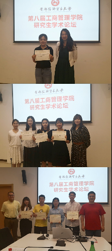 最后,评委老师为同学们颁奖并合影留念。至此,第八届工商管理学院研究生学术论坛圆满落幕。本次论坛共收到近30篇参赛论文。投稿同学既有来自工商管理学院的研究生,也有来自校内其他学院的研究生。经过评审老师严格筛选,9篇论文脱颖而出,进入到论坛汇报展示阶段。论文选题涵盖范围广泛,包括人力资源、公司治理、市场营销等多个研究方向。