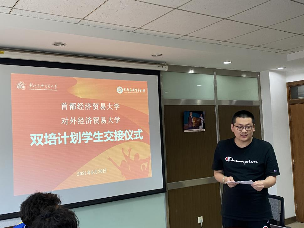 为加强2018级双培生培养与管理的高效联动、无缝对接,落实党史学习教育“我为群众办实事”的工作要求,6月30日下午,在对外经济贸易大学国际商学院举办“首都经济贸易大学、对外经济贸易大学双培计划学生交接仪式”,对外经贸大学国际商学院副院长邢小强、党委副书记梁伟、我院党委副书记陈蒲晶、院长助理孙忠娟出席了此次仪式;外经贸国际商学院院办副主任袁野、辅导员李欣荣、何威澎、我院专职辅导员赵纯瑞及教务秘书景蕊参加了本次会议。