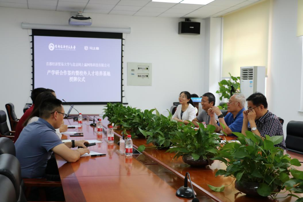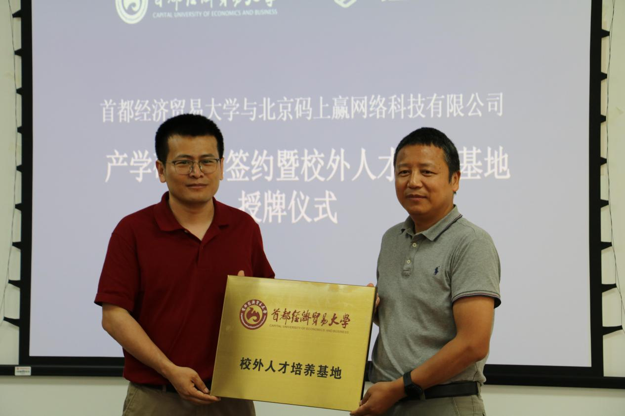 2021年7月2日,首都经济贸易大学工商管理学院与北京码上赢网络科技有限公司在启铸恭温楼D201举行产学研合作签约暨校企合作基地授牌仪式。出席本次会议的有码上赢网络科技有限公司董事长王杰祺、斑马研究院秘书长博文、工商管理学院院长、中国消费大数据研究院院长柳学信、中国消费大数据研究院执行院长陈立平、首都经济贸易大学工商管理学院副院长黄苏萍、工商管理学院市场营销与旅游管理系教授李云鹏等。本次会议由柳学信主持。