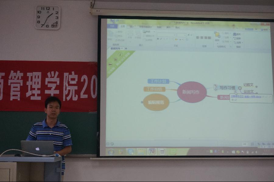 校宣传部冯缘老师对本期学生干部进行通讯、公文写作培训。他列举了新闻稿、通讯写作中的主要要素,为大家举例说明了写作中的常见问题和注意事项,并就不同文体在通讯稿件中运用进行了讲解。通过写作培训,培养和提高了同学们的宣传意识和写作能力。