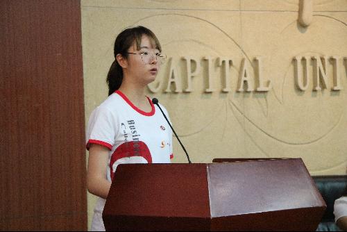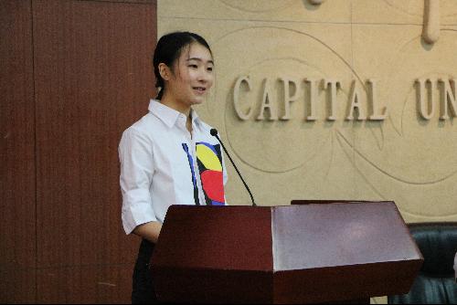 2013级工商管理二班何静华作为老生代表发言,她表达了对新生的祝福和期望。她围绕着“人一定要有梦想”,“越努力越幸运”,“我们是一家”的三个感悟,分享了大学生活和学习经验。