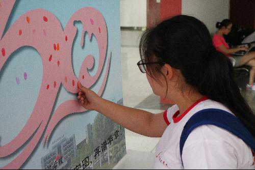 新生代表将用指印摁成的“60”图样的背板赠送给学院,在学校六十华诞之际,祝福学校可以积历史之厚韵,更展宏图,再谱华章。