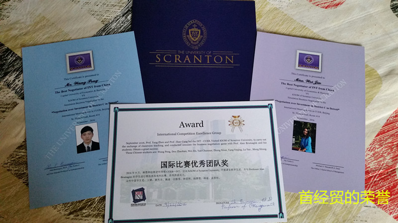在22日代表团在斯克兰顿进行交流比赛。斯克兰顿大学卡尼亚管理学院与我校工商管理学院有十年以上的合作历史,此次接待我们的是Alan Brumagim教授及其MGT351班的全体学生。上午10点我们准时进入 Brennan Hall 103教室,参与“中美跨文化沟通”为主题的课堂教学互动。中午12点至2点,Alan与我们共进午餐并自由交谈。下午2点半至3点半,中美双方代表队来到St. Thomas Hall, 414大教室,以“中国投资商收购美国底特律C区”为题,举行了一场模拟商务谈判交流赛,比赛结束后,杨震老师和Alan从专业角度为参赛双方做了精彩的讲评,赵钢老师代表首经贸向在场的全体师生表达了进一步扩大双边交流的积极愿望。最后,首经贸代表团获得了斯克兰顿大学签发的“国际比赛优秀团队奖”,八位同学获得“最佳谈判手”荣誉称号,他们是:工商管理学院王鹏、窦兆含、杨烨青、路遥;外语系魏谨、钟思然、闫春雪、孟思彤。双方互赠纪念品,交流比赛活动圆满结束。