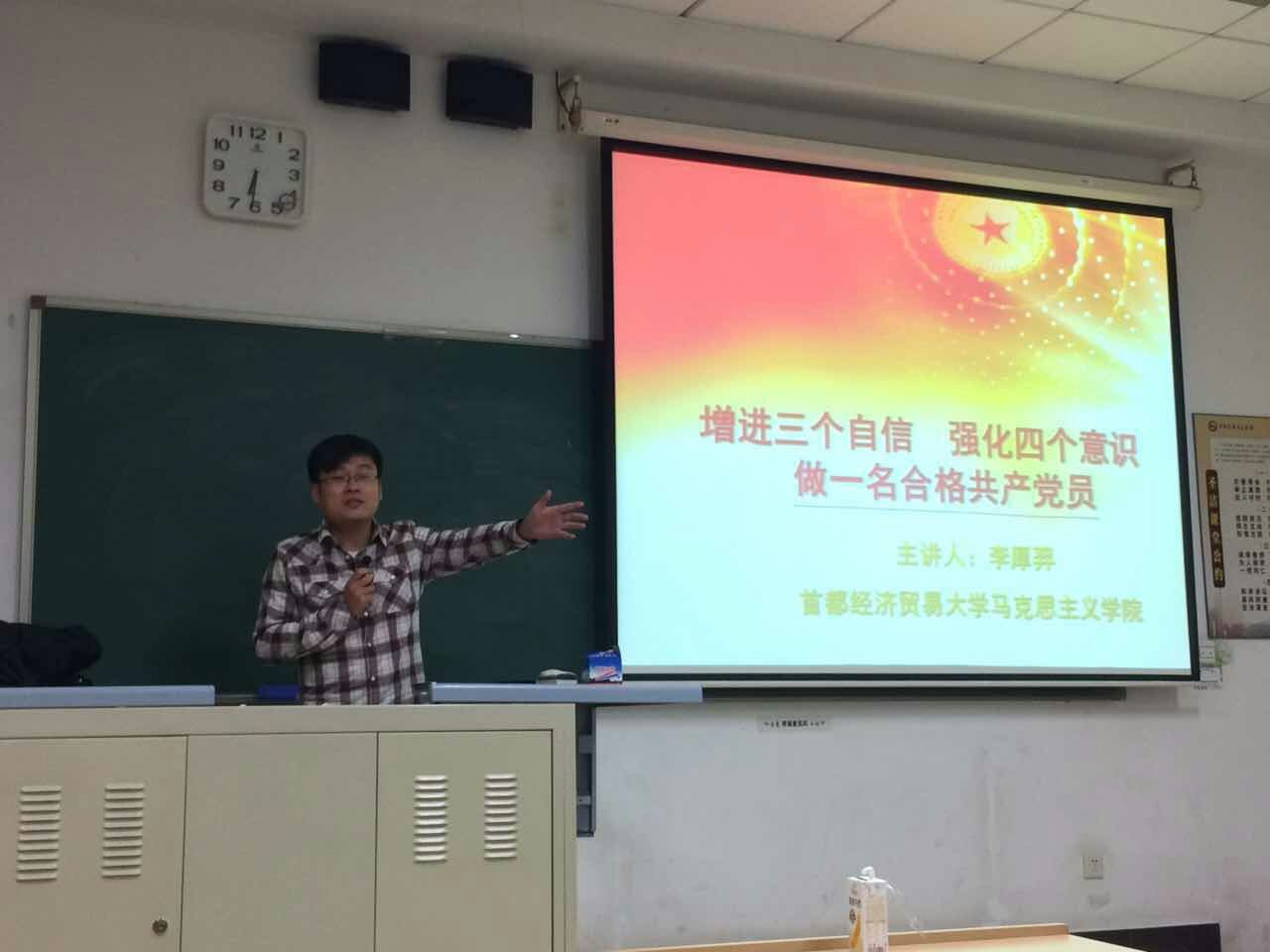 11月15日晚上6:30在博学楼109教室,工商管理学院对本学期入党积极分子和发展对象进行培训,主题为:增进三个自信,强化四个意识,做一名合格的共产党员,由马克思主义学院李厚羿老师主讲。