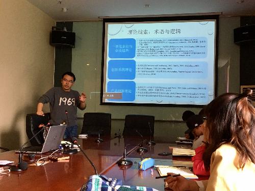首先孙喜从钱德勒式企业的冰火两重天引入,讲述了社会对大企业研究兴趣的降低,而它在全球产业革命及中国产业升级中却发挥着不可替代的作用。孙喜认为,来自中国本土的熊彼特式在位企业在以智能制造为主攻方向的制造升级中更加重要,并选取了两个工业龙头作为深度案例研究对象。接下来,孙喜展开了关于研究思路的讲解。理论线索部分,他着重向同学们普及了“一体化企业与企业边界”、“创新系统理论”、“产品创新理论”,指出其与研究主题的逻辑一致性。经过推导与演变,他总结得出与西方不同,中国的创新系统是一种碎片化、底子薄的“盆景”式结构,这便使得采取激进创新的龙头企业更倾向于通过纵向一体化方式发展互补能力,成为工业体系中重要的“补课者”。孙喜进而提出了三个命题,并结合两家典型企业的基本信息进行比较案例研究,详细分析了它们在产品创新与制造升级中的一体化过程。最后,孙喜将两家龙头与三个命题一一对应,进一步阐明了对中国本土而言,纵向一体化的钱德勒式企业较于其他企业形式的优越性与重要性。会后,曹燚对本此研讨进行了点评,他与作者充分交换观点、交流看法,并向大家介绍了他关于“产业创新”、“知识平台”等概念的理解,指出只有集中力量才能实现制造升级、科技突破与变革发展。两位老师还耐心详尽地解答了同学们的问题与疑惑,深入浅出、思路清晰、直指重点。听罢他们的讲解,大家纷纷表示颇有启发、获益良多。