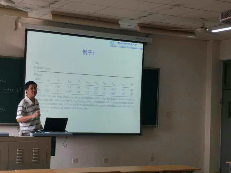 5月2日上午,对外经济贸易大学国际经济研究院国际投资研究室主任、中国资本运营研究中心副主任,陈建勋教授做客工商管理研究工坊第21期,为我院博士生和青年教师讲解非线性中介调节综合模型的理论和应用。