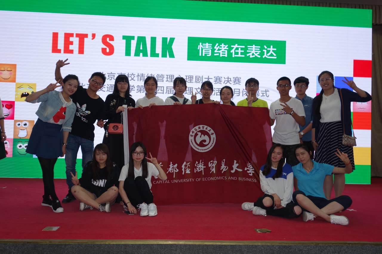 “LET’S TALK” 情绪在表达北京高校情绪管理心理剧大赛总决赛5月13日在北京交通大学中心报告厅举行,工商管理学院代表我校参演的话剧《等待天晴》从北京市30所高校的31个优秀参赛作品中脱颖而出,成功入围决赛。来自六所高校的话剧进行现场表演比拼,最终我校荣获二等奖。