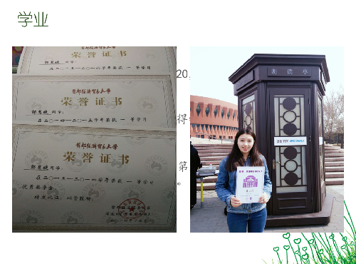学术竞赛方面,我也不甘落后。大二时,尝试带队参加GMC企业模拟挑战赛,这是我第一次接触商业竞赛,第一次尝试把课本和实际结合起来。经过一步步的探索,一次次的计算,一场场的讨论,虽然最后结果不是很理想,但是这却是我成长最快的一次,为之后的竞赛积累了不少经验。大三时,我们几个志同道合的小伙伴又一起参加了涉及管理类、理工类等方面的许多竞赛,也获得了不少成果:商业精英挑战赛物流管理竞赛全国二等奖、互联网+北京市二等奖、挑战杯北京市铜奖等等。竞赛让我收获的不仅仅是荣誉,更多的是一份勇于钻研的决心,善于倾听的耐心和不断坚持的恒心,在这个过程中,压力与成就感并存,让我能够享受其中。
