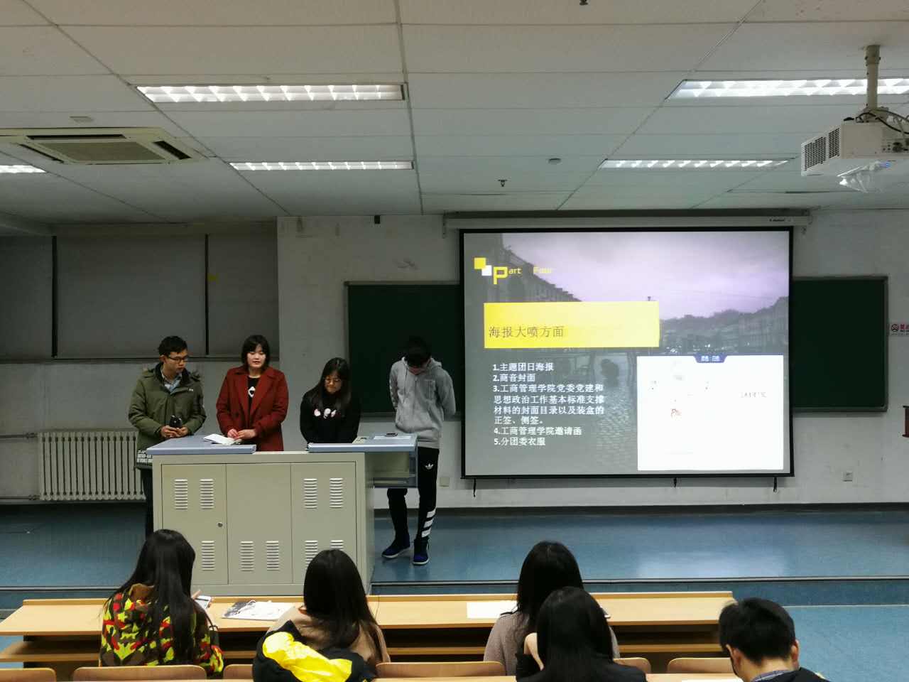 12月27日晚上六点,我院分团委在博学楼第二阶梯教室成功举行工商管理学院分团委2017-2018年度第一学期总结大会。潘镜宇老师、三位分团委副书、分团委各部门部长及部员参加了本次大会,本次大会由分团委副书记刘依依主持。