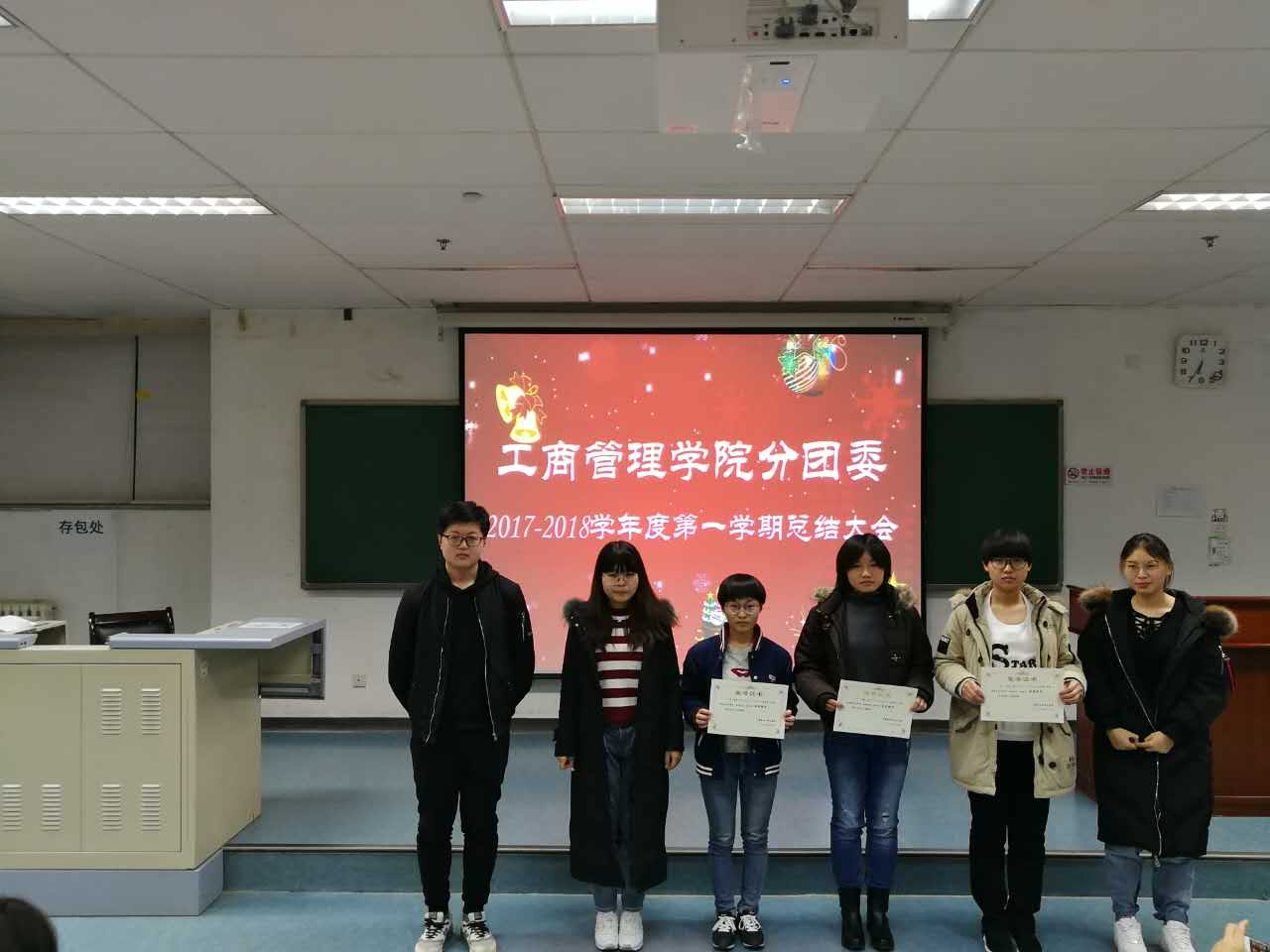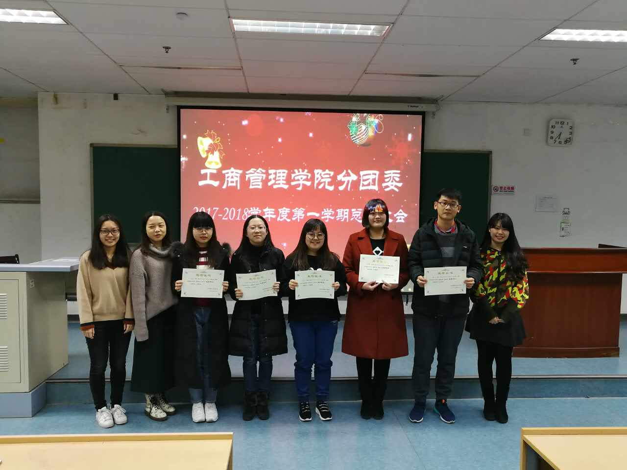 最后,大家上台合影。工商管理学院分团委2017-2018年度第一学期总结大会圆满结束!