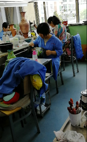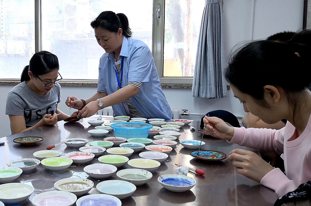 最后,在公司高级技师的指导下,学生代表参与了体验了点蓝。工作人员将还未点蓝的景泰蓝分发给参观人员,示范点蓝的技巧及需要注意的细节,并在参观人员的体验过程进行指点。