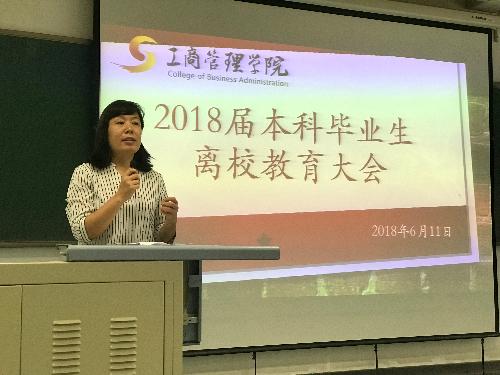为做好毕业离校收尾工作,工商管理学院高度重视离校工作,于6月11日上午在博学楼第四阶梯教室召开了2018届本科毕业生离校大会。工商管理学院党委副书记李娟婷、专职辅导员王璐、张泽远和18届本科毕业生参加本次离校大会。