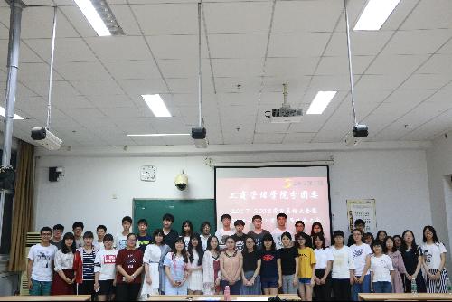 全体参会人员上台合影留念。自此,工商管理学院分团委2017-2018学年总结大会暨2018-2019学年换届选举大会圆满结束。