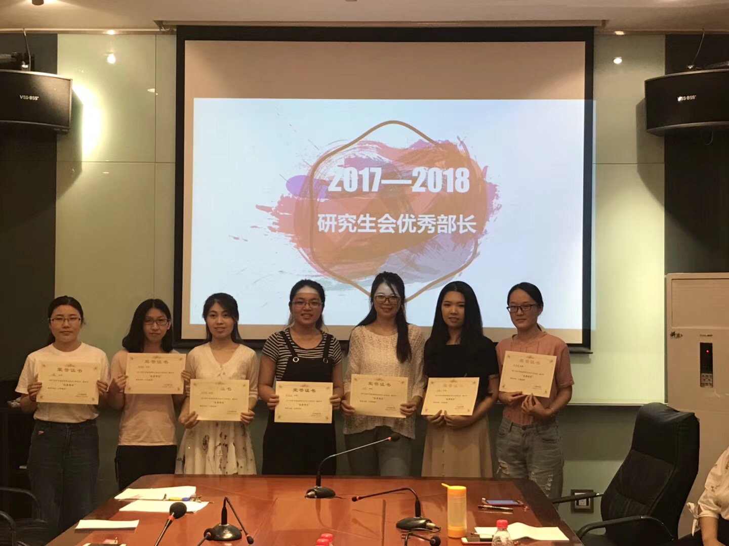 本次会议分为2017-2018年度研会工作总结、优秀部长选举、优秀主席与优秀部长颁奖仪式、新一届研会主席团竞选发言及选举四个环节。首先,2017级研究生会主席王琪就过去一年研究生会的发展与建设进行了陈述,并对文体与国际交流两个板块的活动作出了总结。她表示,过去一年,研究生会成功举办了“首届师生新年联欢会”、“国际文化交流节”、“师生趣味运动会”等多项活动,并在“乒羽篮联赛”中取得优异成绩,这些都离不开学院老师们的支持与研会成员们的辛勤付出。副主席黎思源汇报了宣传部一年来的工作,包括各类新闻写作,学院公众号“商言”的运营,各项采访,“悦读悦享”读书分享会的举办,各种宣传品的制作等,内容丰富,宣传到位。副主席刘培培对学术实践部的工作成果进行了回顾,她提到,学术实践部顺利举办了“商与学”学术论坛、“研究生就业分享会”、各种学术讲座等多项活动,开创并维护了讲座签到制度,并通过问卷调查及时向学院反馈同学的意见与建议,发挥了研会在学院与学生间的桥梁作用。