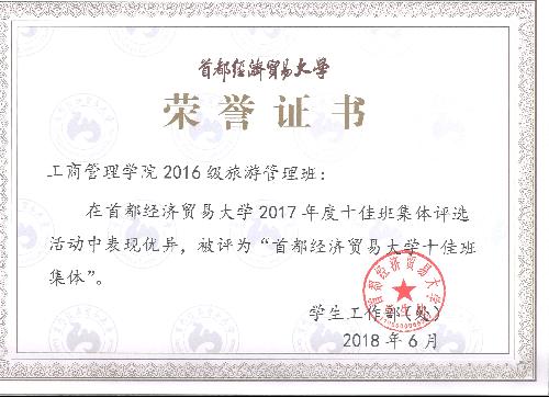 2016级旅游管理班获2017年度“首都经济贸易大学十佳班集体”