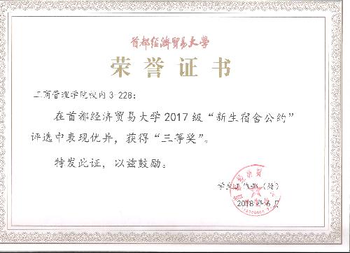 宿舍是同学们温暖的家,是我院学生工作中重点建设单元。我院校内3-228宿舍在“新生宿舍公约”评选中荣获“三等奖”。