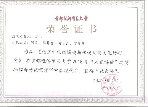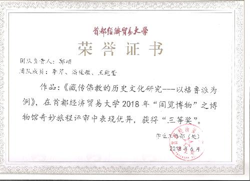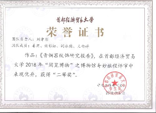 以史为鉴,可以知兴衰。我院积极组织同学们参加“博物馆奇妙旅程”活动,旨在帮助同学们多了解历史,结合专业,深入学习。在本次评比中,由刘津彤为负责人,姜丽、任彩虹、闫冰俏、王雨婷等提供的参赛作品《青铜器纹饰研究报告》荣获“二等奖”; 由郭硕为负责人,李芹、潘佳敏、王乾莹等提供的参赛作品《藏传佛教的历史文化研究——以格鲁派为例》荣获“三等奖”; 由陈玮为负责人,张宏、毕鑫容、黄子业、贺子祺等提供的参赛作品《北京中轴线城楼与传统胡同文化的研究》荣获“优秀奖”。