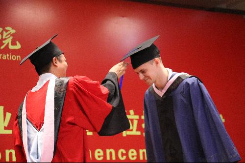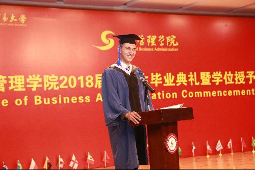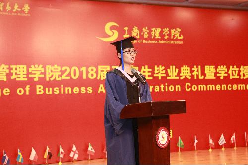 留学生毕业生代表Danci Petre激动地讲述道来到首经贸求学后认识了世界各地的朋友,在学校学习的时光成为他生命中不可缺少的一部分。Petre感谢学校、学院的栽培,自己的家乡罗马尼亚是一带一路沿线国家,他会用自己的所学投身家乡建设,为一带一路发展贡献力量。衷心祝福母校、祝福学院未来发展的越来越好。