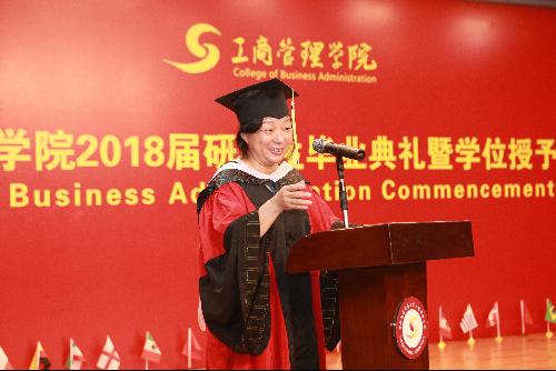 接下来,导师代表、校友代表与毕业生代表依次进行了发言。导师代表吴冬梅教授做了幽默风趣却寄意深长的讲话,其精彩发言获得接连不断的掌声。她提出管理学是平衡制度和人性,商业和人文的学科。同学们要有运动员精神,永不放弃直至终点。同时也要时刻秉承团队精神,处理好个人成功和团队成功间的关系。