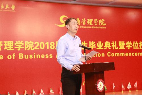 7月6日上午11点,我院2018届硕士研究生毕业典礼暨学位授予仪式在工会活动中心举行。我院院长柳学信教授、党委书记金京虎老师、副院长徐炜教授、范合君教授、关鑫副教授、党委副书记李娟婷老师、国际学院副院长朱红老师、罗马尼亚驻华大使代表二等秘书莫米海、校友代表北京外企人力资源服务有限公司副总经理2009届毕业生周德生校友与研究生毕业生共同参加本次典礼。我院包括博士生、留学生、学术型硕士、MBA、同等学力硕士在内的183名2018届研究生毕业生共聚一堂,分享喜悦,见证毕业生走出院校,迈向人生新方向的历史性时刻。