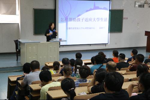 潘老师对家长的到来表示欢迎,她列举了一些大学生常见的校园问题及家长们的认识误区,希望家长提高对新生的关注和关怀,帮助孩子实现从高中到大学的过渡,更好、更快地适应大学生生活,为新生今后的学习生活打下坚实的基础。