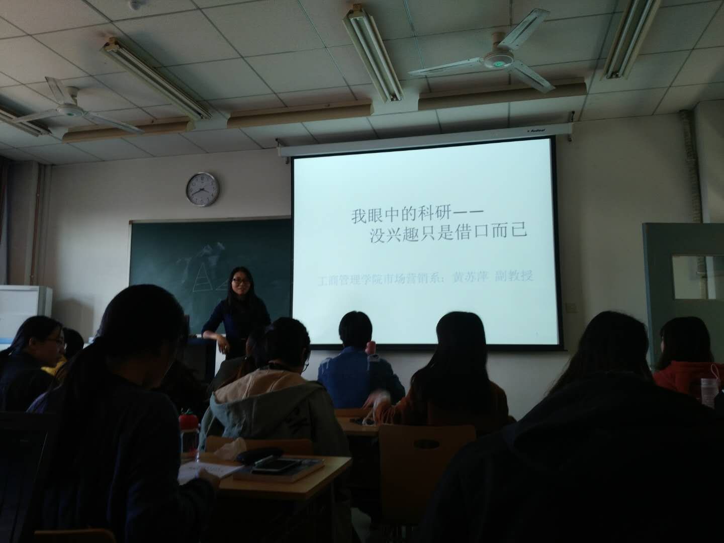 10月16日下午,我院与研究生处联合举办的“研究生科研创新系列讲座”第四讲在华侨学院A308举行。本次讲座邀请到了我院院长助理、市场营销系黄苏萍副教授为研究生带来题为“我眼中的科研——没兴趣只是借口而已”的精彩讲述。我院2018级全体研究生参加了此次讲座。