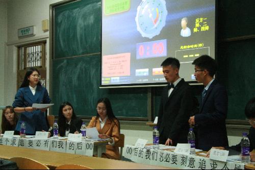 2018年10月24日晚,工商管理学院2018级新生辩论赛决赛在慎思楼204教室拉开帷幕。本次比赛的辩题是“00后的我们有没有必要刻意追求个性”,工商二班代表队和工商六班代表队就此辩题展开。评委组由陈今尧等经验丰富的领队组成,我院分团委书记潘镜宇,学生专职辅导员张泽远、肖潇及2018级全体新生参加了本场比赛。