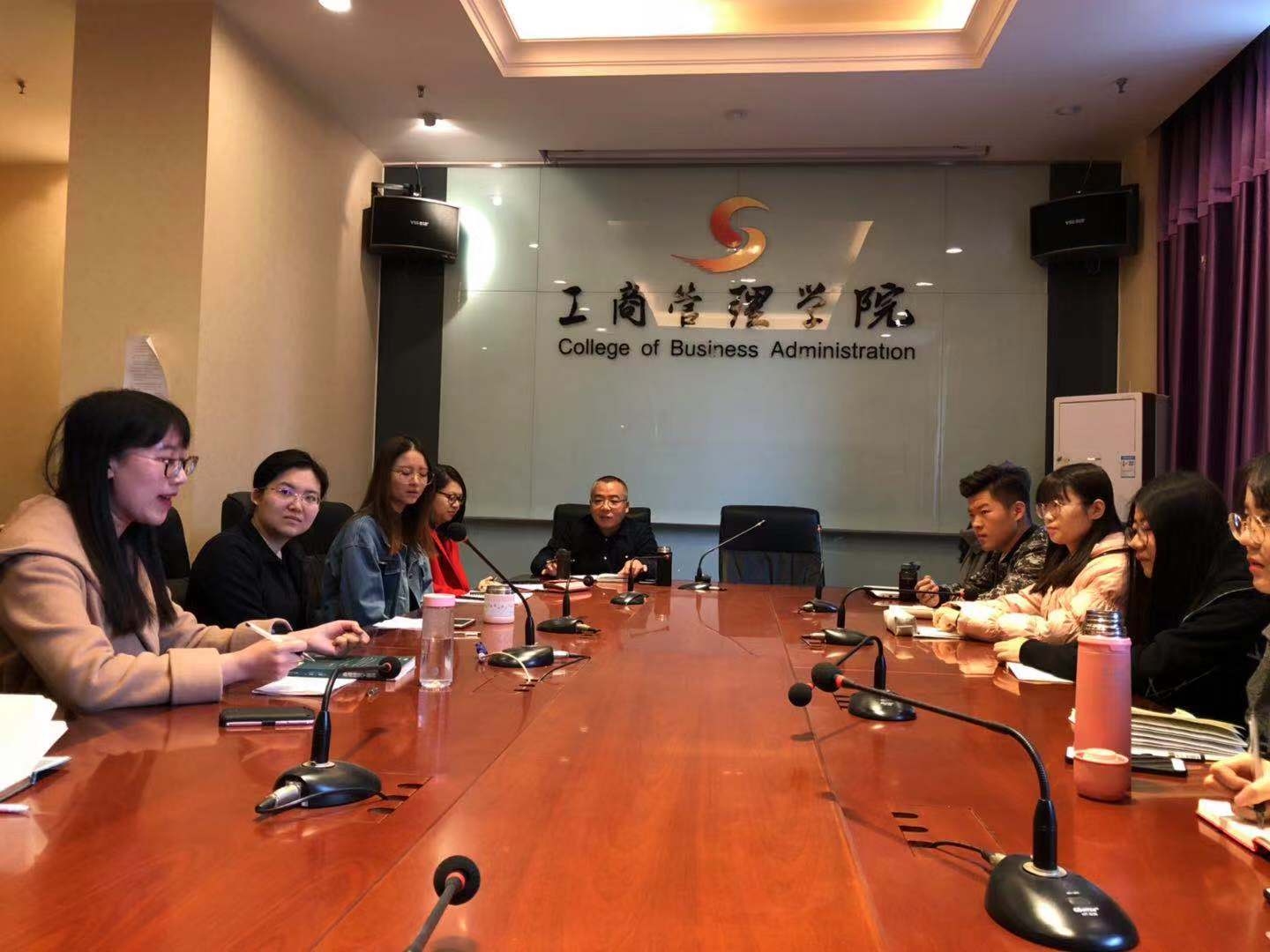 11月12日上午,工商管理学院举办的研究生入学座谈会在敏行楼新会议室召开。工商管理学院副院长范合君教授、战略管理系主任张晗副教授、电子商务系主任翟春娟副教授、院长助理李研博士、科研秘书贾辰歌老师、教学秘书王莹莹老师出席了本次座谈会。2017、2018级部分研究生参与此次座谈。座谈会由范合君主持。