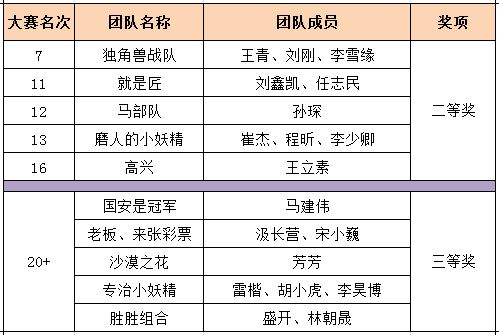 经过为期7天的初赛比拼以及1天的紧张决赛,最终我中心五支队伍获得二等奖,五支队伍获得三等奖,其中独角兽团队(成员:王青、刘刚、李雪缘)在全部57支参赛队中获得第七名的好成绩。