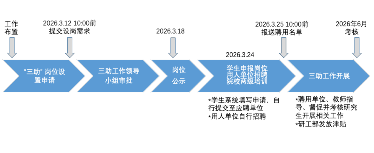 为提高我校研究生参与学校管理、教学、科研的积极性,增强研究生自教自管和实践创新能力,发挥研究机构和导师参与人才培养的作用,依据《首都经济贸易大学研究生助教、助研、助管工作管理办法》要求,现将2025-2026学年第二学期研究生助管、助教、助研(以下简称“三助”)岗位聘用事宜通知如下: