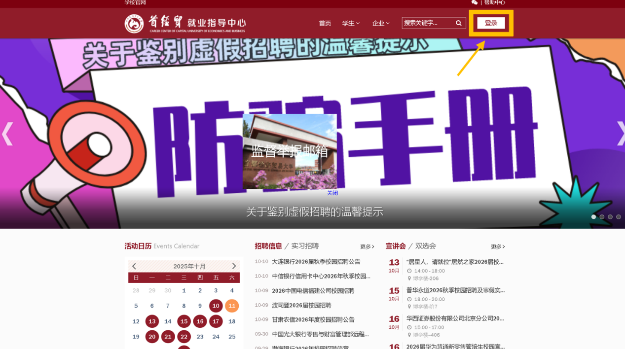 从首经贸就业指导中心官网(网址:https://jy.cueb.edu.cn)右上角学生登陆入口进入个人账户,用户名为学号,密码为校内统一认证密码。点击“登录”进入系统主界面。