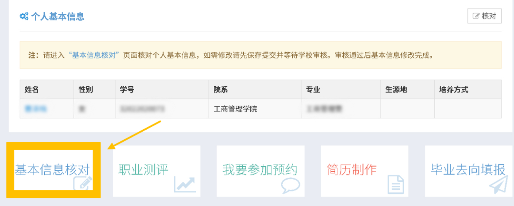 选择“基本信息核对”。在学生基本信息部分,请核对本人生源地、证件号码等信息,如有错误,请修正完成后点击提交,等待老师审核。