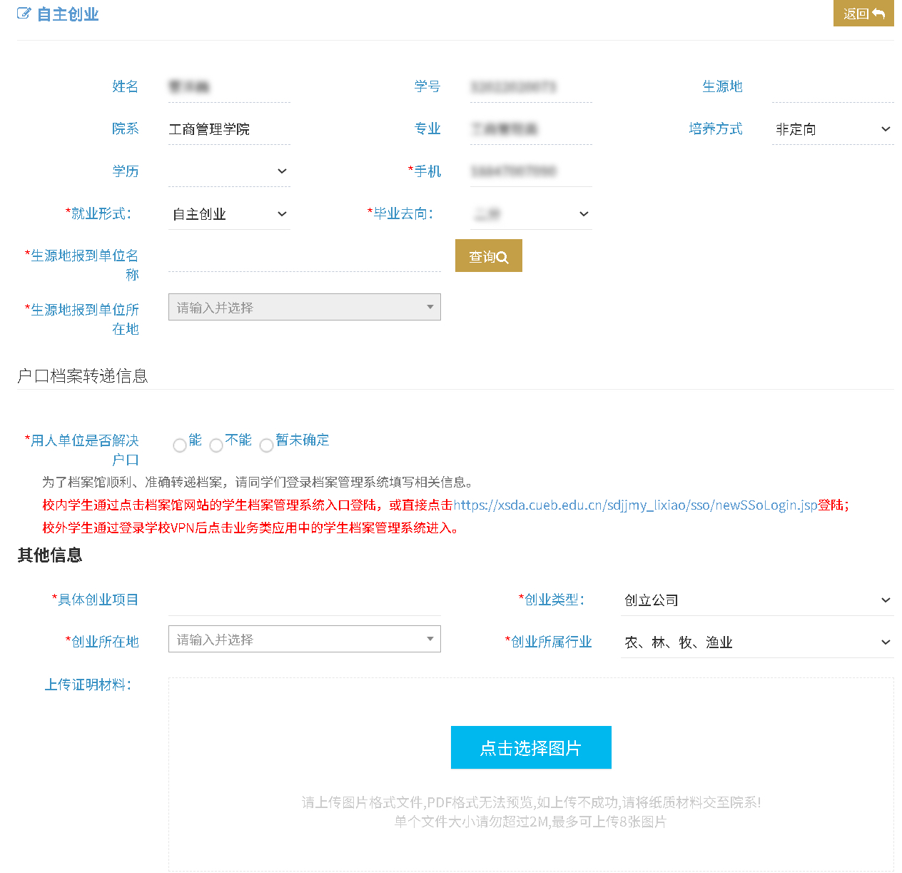 进行信息填写:带星号的信息需要毕业生自己填写,其他由系统直接生成的信息需毕业生自行检查是否有误。