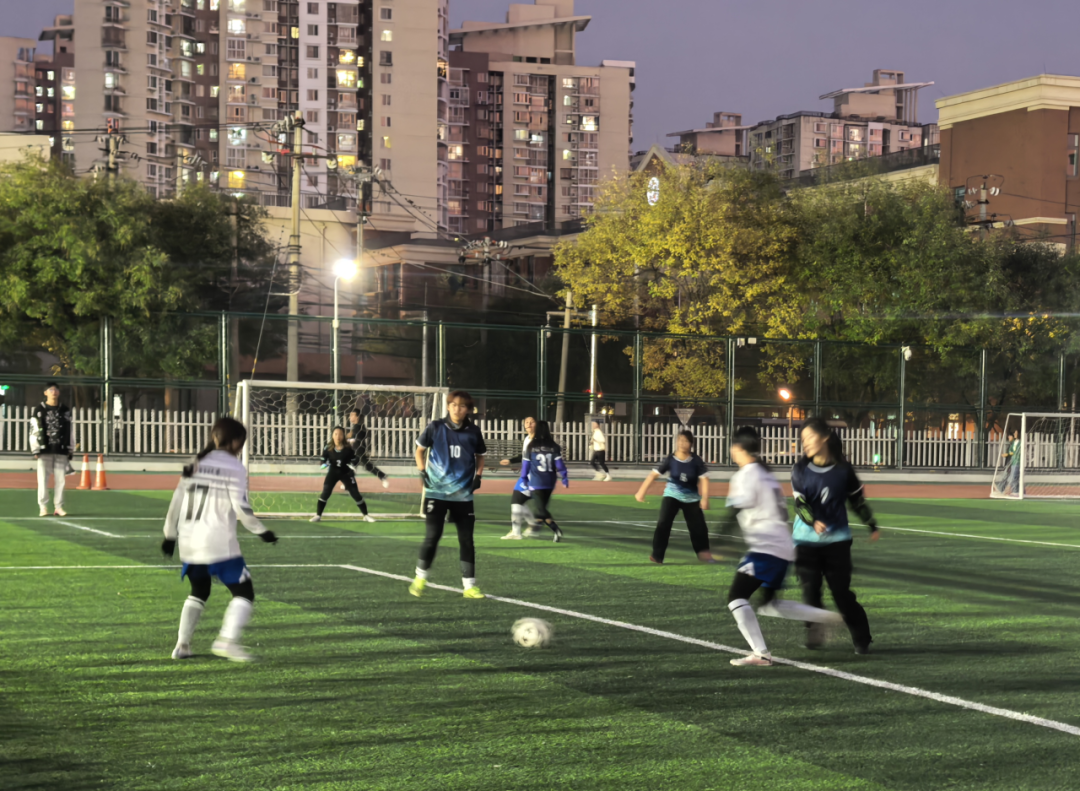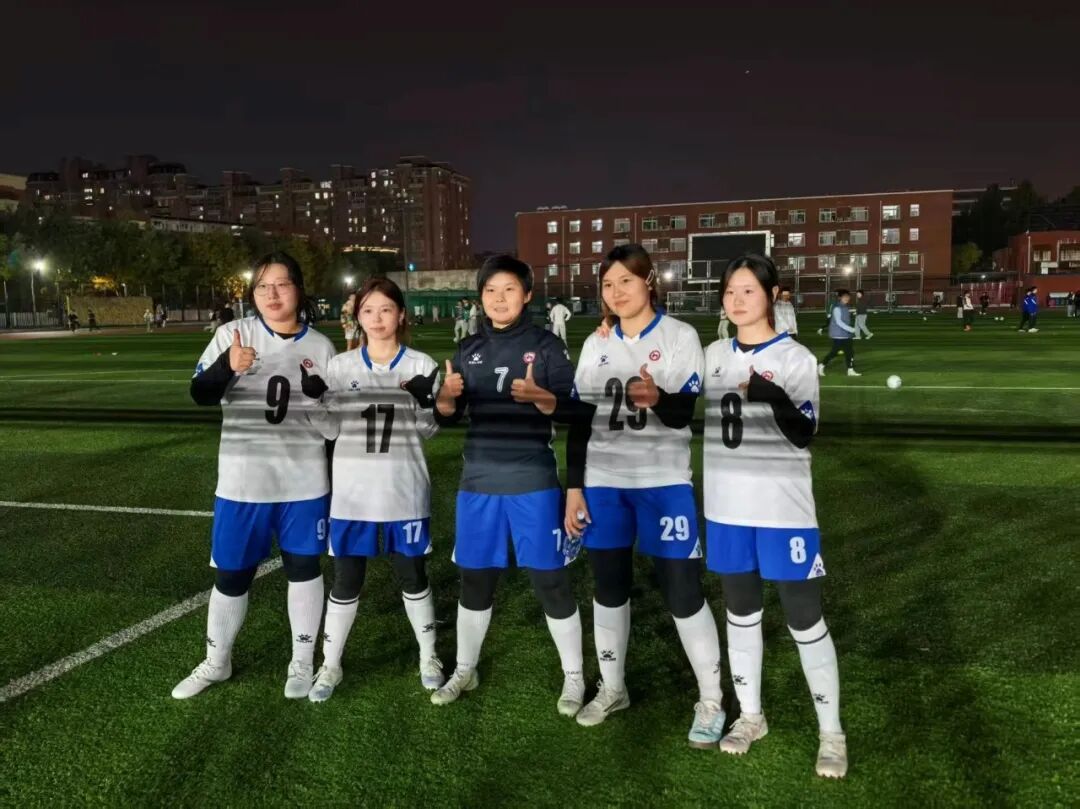 上半场比赛伊始,战火便迅速点燃。29号李子缘与17号贾若含默契的长传,差一点就攻破球门,瞬间点燃全场!对手的进攻同样凶猛,我方门将7号赵琳坤连续做出关键扑救,死死守住球门。随后,8号徐安然、9号黄雨阳与17号贾若含在中场打出连续短传配合默契,可惜射门出现偏差。尽管全队奋力防守,但遗憾仍被对手踢进一球。面对落后,我院女足请求一分钟暂停,队员们围拢商讨,互相鼓劲,士气不降反升!暂停归来,29号李子缘、9号黄雨阳连续大脚远射,持续威胁对方球门,全队球员奋战至上半场最后一刻。