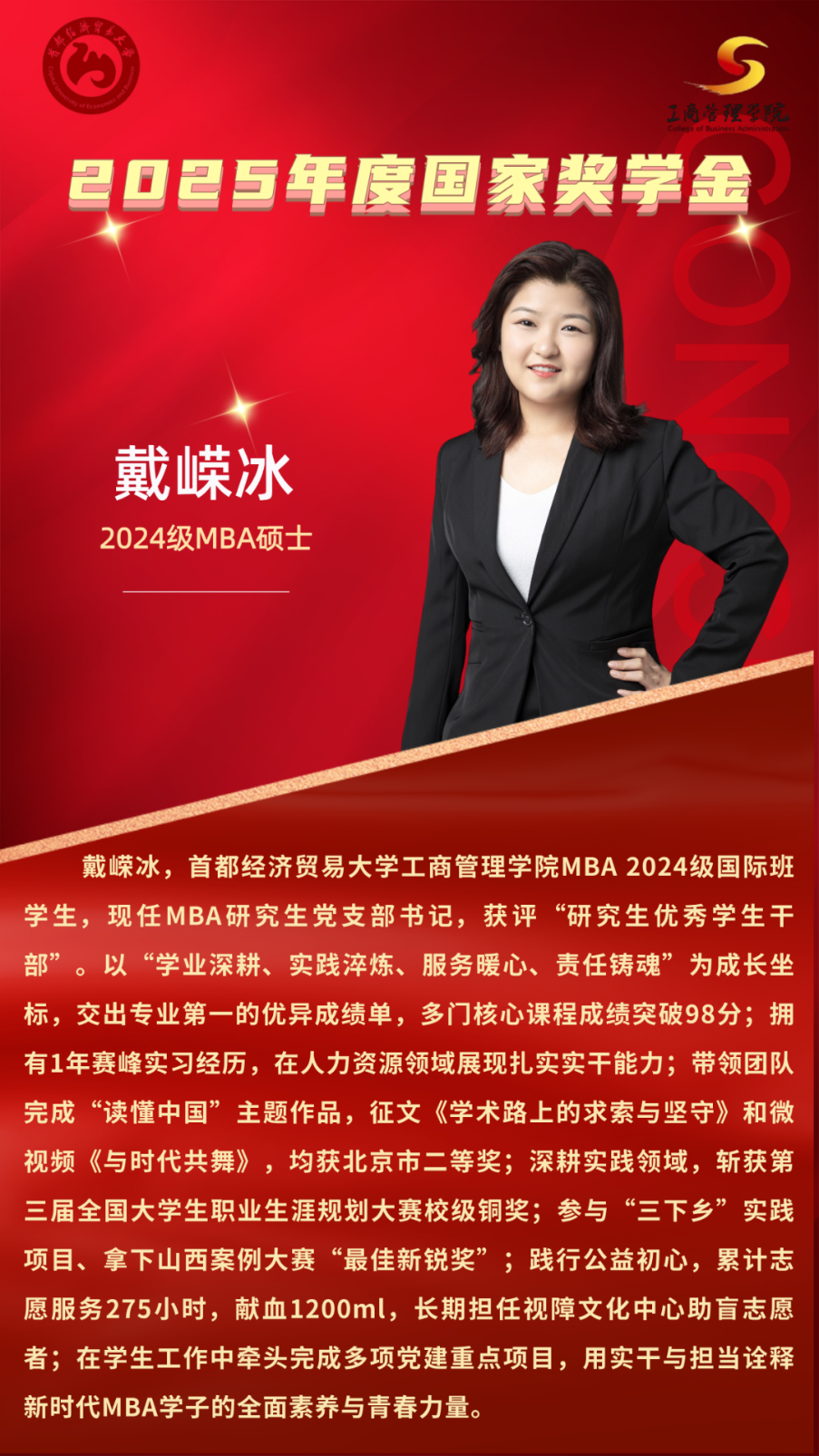 戴嵘冰,首都经济贸易大学工商管理学院MBA 2024级国际班学生,现任MBA研究生党支部书记,获评“研究生优秀学生干部”。以“学业深耕、实践淬炼、服务暖心、责任铸魂”为成长坐标,交A出专业第一的优异成绩单,多门核心课程成绩突破98分;拥有1年赛峰实习经历,在人力资源领域展现扎实实干能力;带领团队完成“读懂中国”主题作品,征文《学术路上的求索与坚守》和微视频《与时代共舞》,均获北京市二等奖;深耕实践领域,斩获第三届全国大学生职业生涯规划大赛校级铜奖;参与“三下乡”实践项目、拿下山西案例大赛“最佳新锐奖”;践行公益初心,累计志愿服务275小时,献血1200ml,长期担任视障文化中心助盲志愿者;在学生工作中牵头完成多项党建重点项目,用实干与担当诠释新时代MBA学子的全面素养与青春力量。