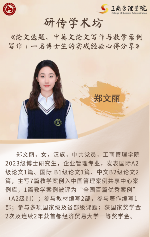在本期“商研智汇——研传学术坊”活动中,郑文丽同学以其扎实的科研积累与丰富的实战案例,为同学们系统梳理了从选题到写作、从论文到案例的全流程研究方法。其内容详实、逻辑清晰、操作性强,为研究生同学们的学术探索与论文发表提供了极具价值的参考。