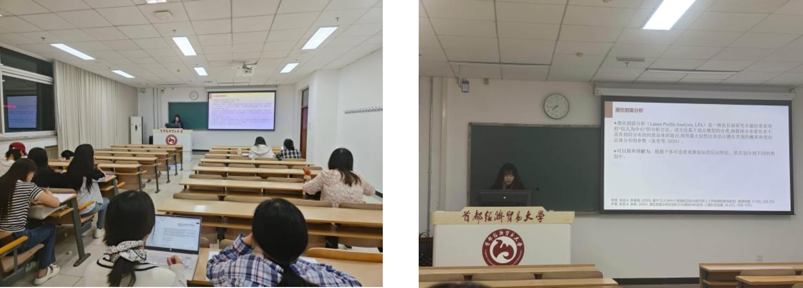 本期“商研智汇——研传学术坊”系列分享会邀请到了工商管理学院2023级学术型硕士研究生吕虹洁开展主题为《潜在剖面分析的概念与运用》的经验分享。本次交流结合其在中国社会心理学会管理心理学专业委员会2025年学术年会暨第七届中国管理心理学/组织行为学论坛的收获和现有研究情况,重点探讨了潜在剖面分析(Latent Profile Analysis, LPA)的理论基础、建模流程与实证应用等方面的实用技巧,旨在为研究生群体提供深入的科研方法指导。