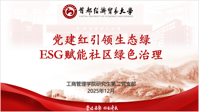 在红色“1+1”示范活动评审中,工商管理学院研究生第二党支部以出色的组织力、凝聚力和实践力脱颖而出,荣获二等奖。支部以“党建红引领生态绿:ESG赋能社区绿色治理的共建实践”为主题,以“红色引领、专业赋能、实践砺才、长效共建”为核心,依托工商管理学科背景,深入对接万年花城第二社区,将ESG理念与基层绿色治理深度融合,探索出一条“红色铸魂、治理增效、科研反哺、生态育人”的校地共建新路径,充分展现了高校党支部服务首都高质量发展、助力美丽中国建设的担当作为。