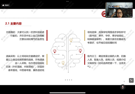 李欣雨同学围绕活动主题展开分享,介绍了三大参考创作方向,点明创作初衷是让当代青年与百年前青春对话,诠释“时代担当”。实操层面,她建议可翻拍资料视频并融入个人理解,保证台词情节连贯;道具由专人统一采购回收,场地优先选择校内及周边标志性地点并提前考察,组内明确出镜、拍摄、剪辑等全部分工。